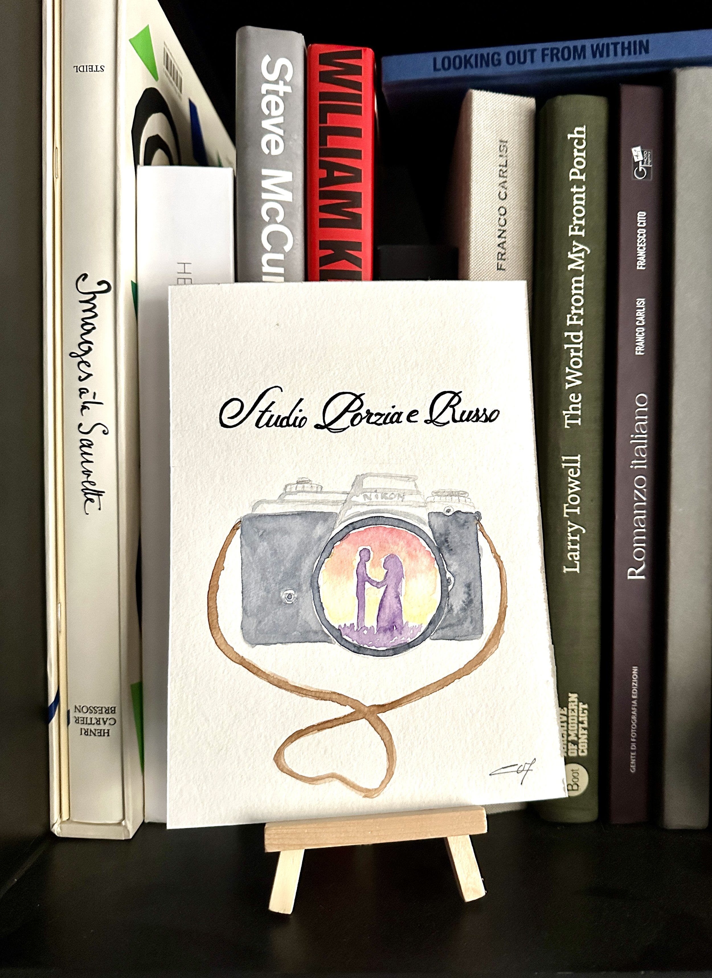 Una creatività che ha preso forma nei disegni ad acquerello realizzati da lei, utilizzati per tableau, centrotavola e piccoli dettagli del ricevimento. Un lavoro artigianale e personale che ha dato alla giornata una firma visiva unica. Anche noi dello staff abbiamo ricevuto un’illustrazione dedicata, che oggi conserva un posto nella libreria del nostro studio.